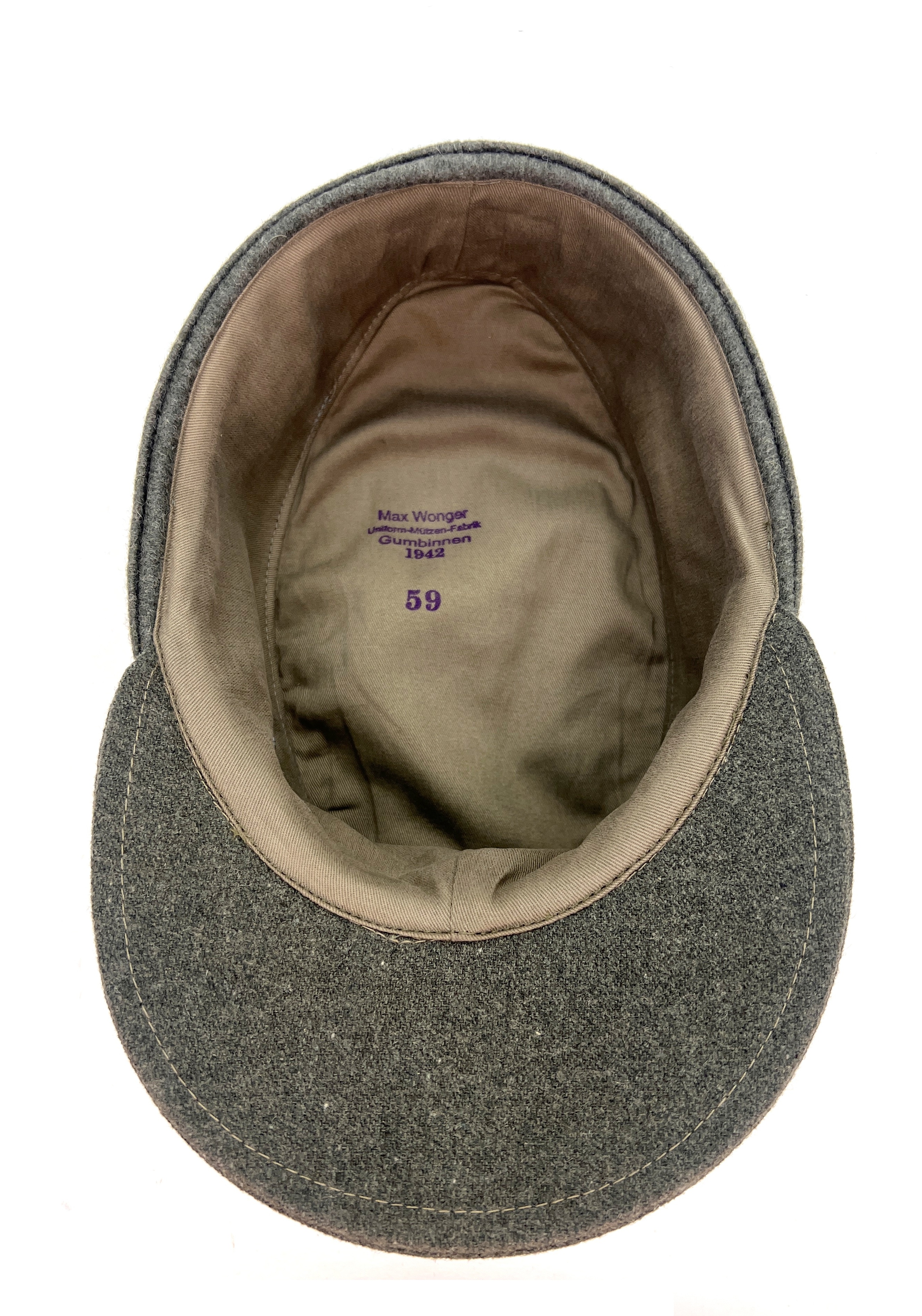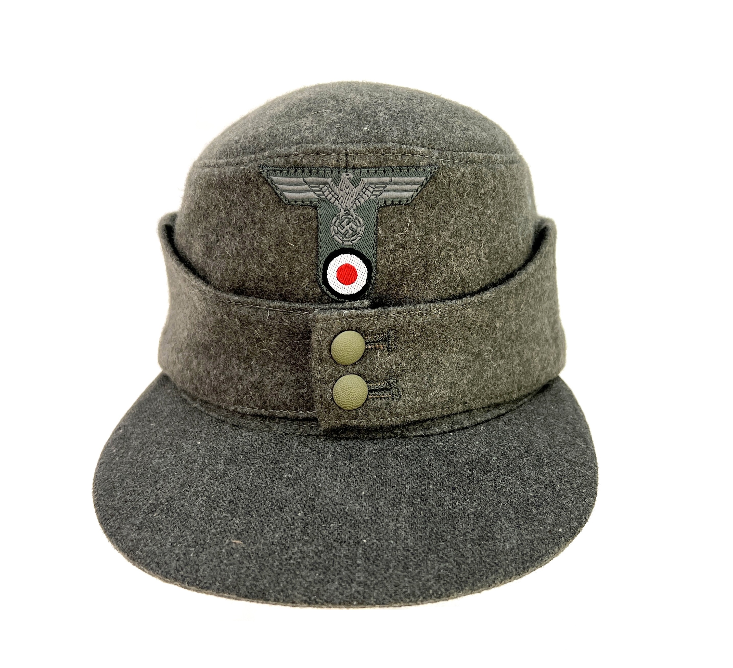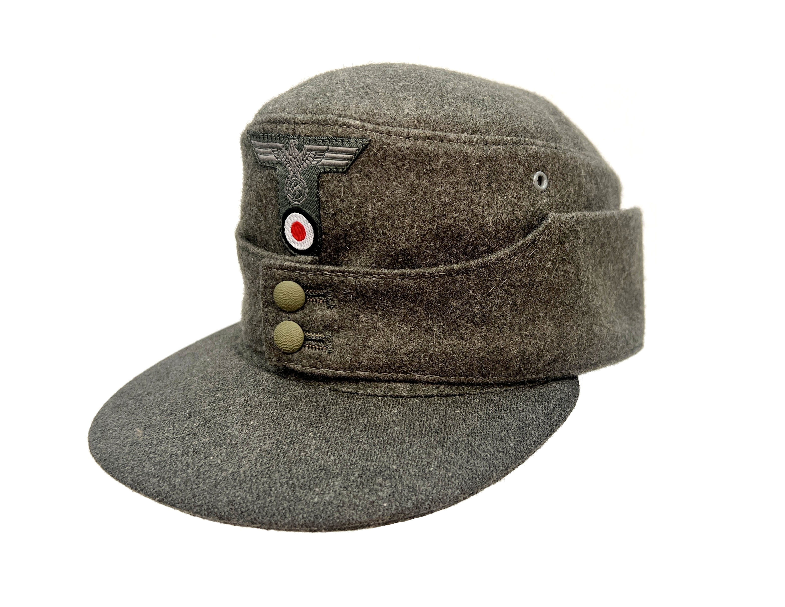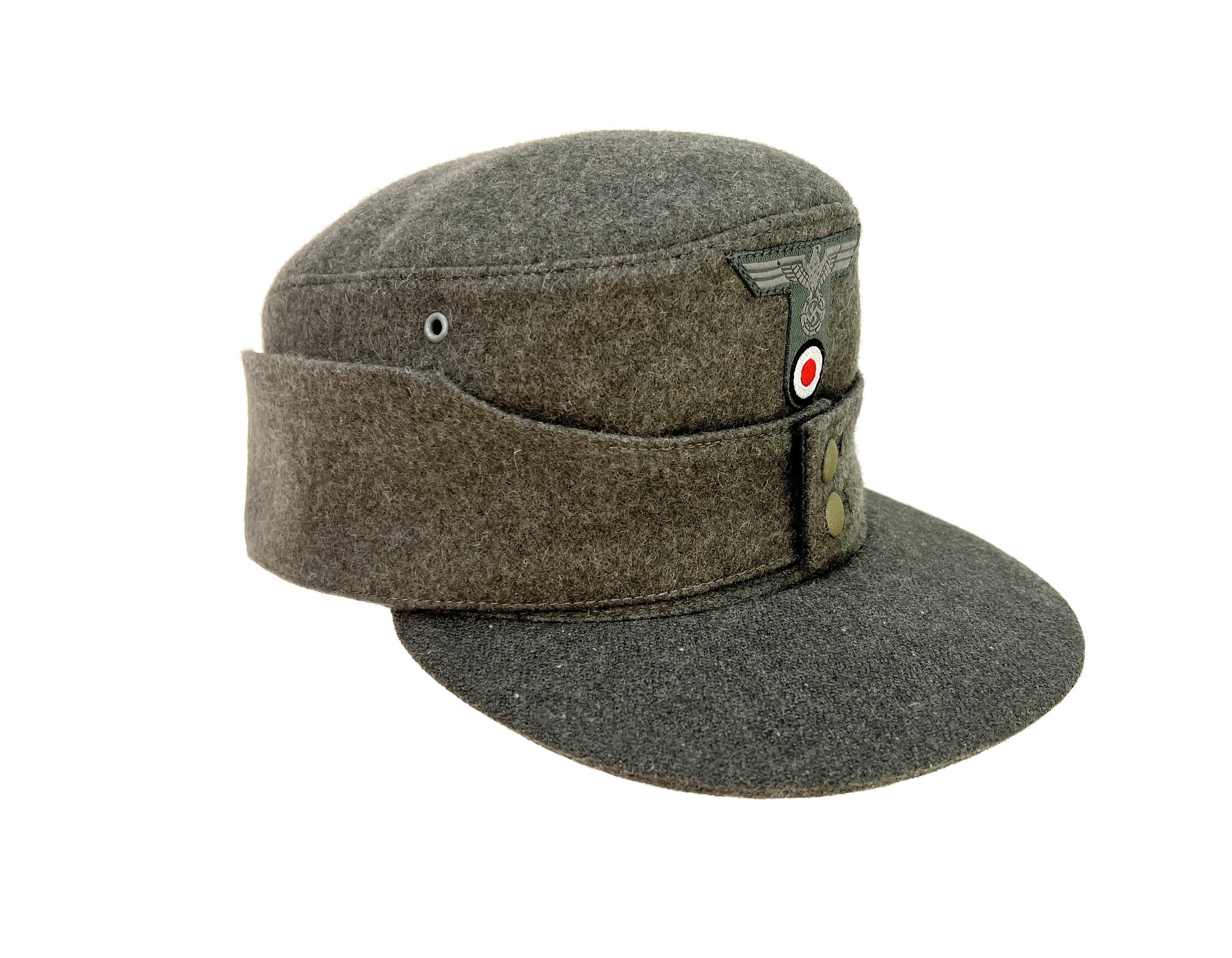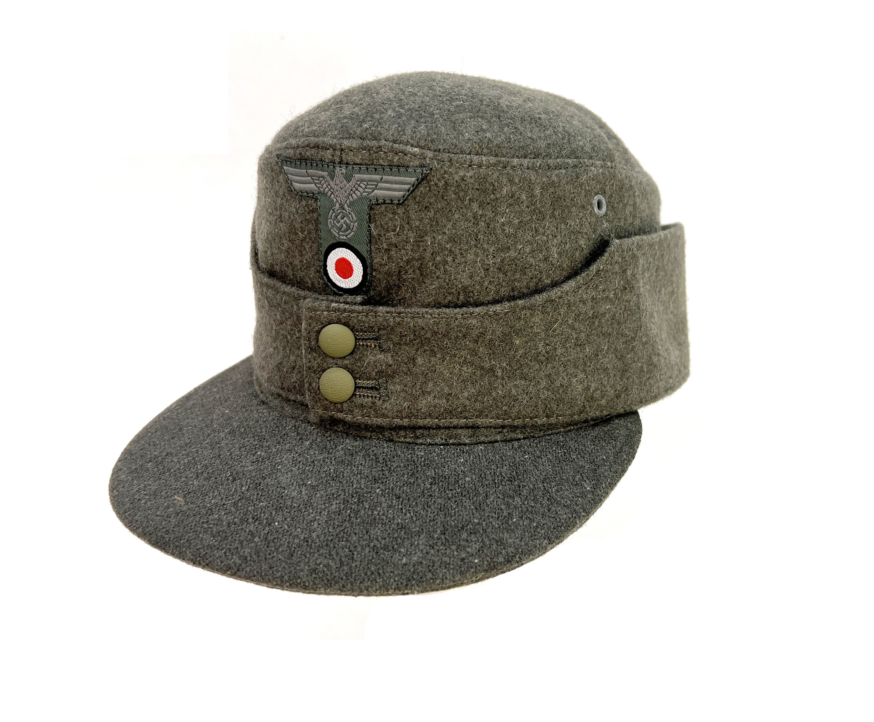 Reproduction of converted Heer M42 billed Einheitsfeldmütze, as was commonly done at the time, this standard issue M42 cap had a bill made of aged reproduction fabric, added giving the appearance of the popular M43 cap. Converted M42 caps are often observed in period photos and they are not so rare!